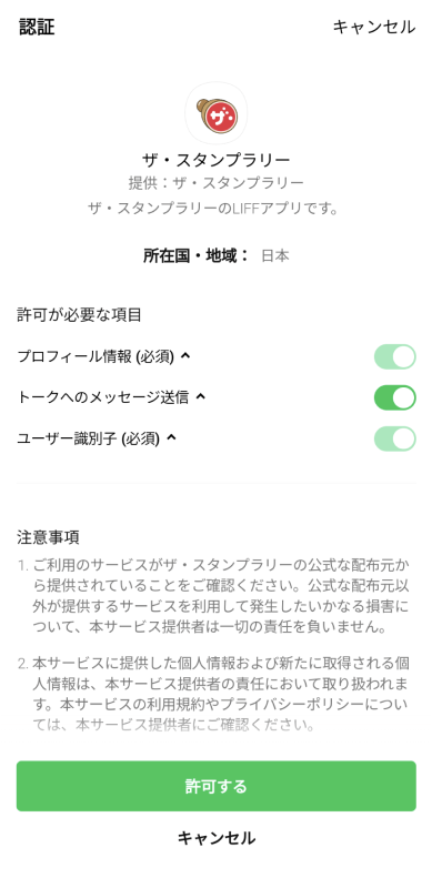 LINEのカメラ機能で認証用QRコードをスキャンし、ザ・スタンプラリー(抽選タイプ)のLINE認証をします。